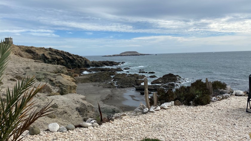 When we pulled into Acension, it was a normal windy day on the Pacific side of the Baja and guess what… We were stuck in the van by the hurricane force winds. We found the hotel by a referral from my cousin, who lives in Acension permanently, at least for now. They had two small rooms around the back of the complex. The room had a large double bed a window, night stand, ceiling fan, and typical plastic chair. The bathroom had a warm shower, depending on who was showering, and a flush toilet. Best part of the hotel was the patio area which ended up facing the perfect way to block the wind and enjoy the sun. Everyday we’d gather on the back porch and enjoy the sun and the view. The tide coming in would cause the waves to crash on the rock buttress and blow up through the natural blow holes. The sound was thunderous.