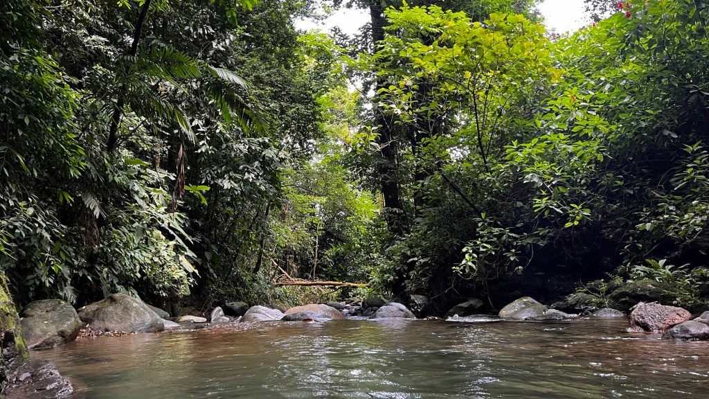The contrasts of incredible greens, heavy shadows, opposing fern covered cliffs, huge old growth trees and a torrent of white water snaking its way between boulders and rocky steps, accented by the filtered sunlight. The water is as pure as the landscape and refreshingly cool but not cold as a river in Utahs Uinta mountains would be. Best part… we had the whole place to ourselves, except for our new cat friend. He bounded around chasing butterflies and geckos. He danced over the rocks, floating from top to top and leaping into the air. He posted himself on the highest rock like a black panther protecting its young.